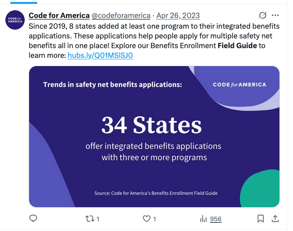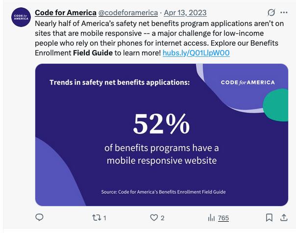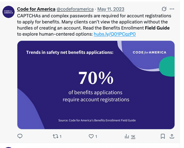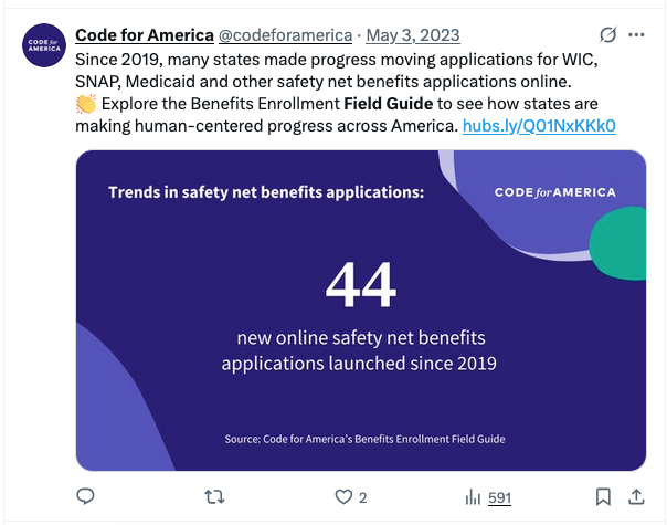 Code for America’s Benefits Enrollment Field Guide is a research-backed resource funded by the Bill & Melinda Gates Foundation. It is designed to help assess the state of safety net benefits access and highlight best practices and real examples of how governments can use human-centered design principles to make online benefits processes simpler, faster, and more equitable.