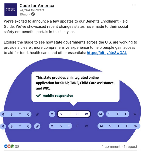 The Benefits Enrollment Field Guide earned media placements in StateScoop, StateTech, GovTech, and APHSA’s Policy & Practice Magazine. The website was also a 2024 Nonprofits Communications Award Finalist from PR Daily.